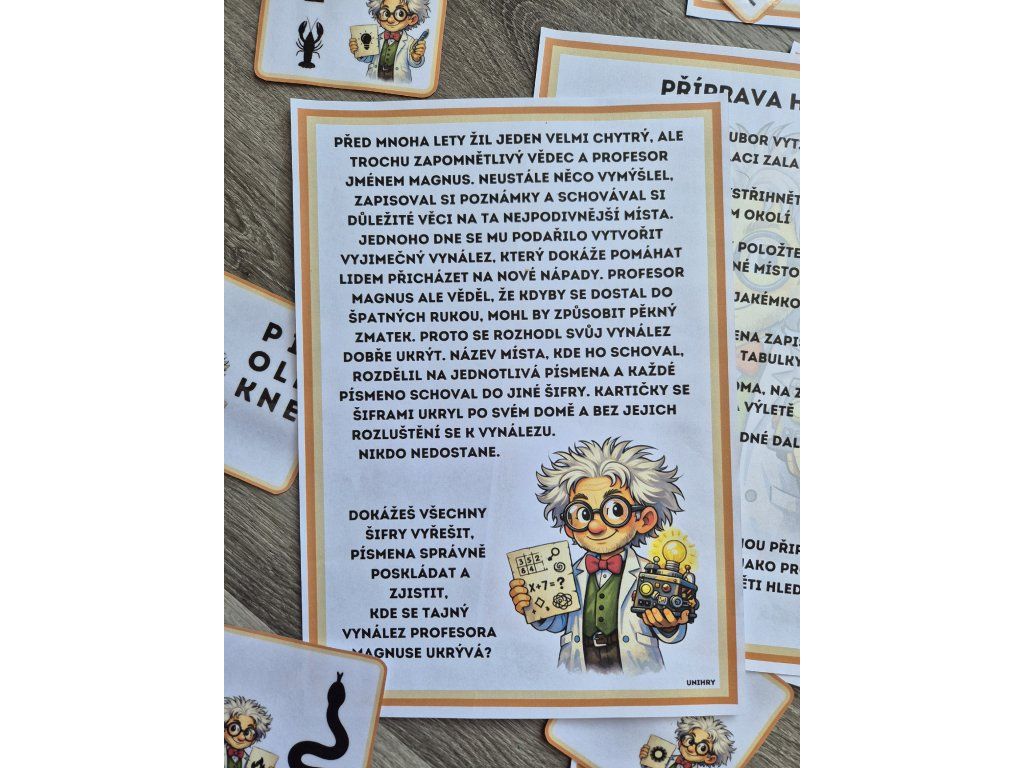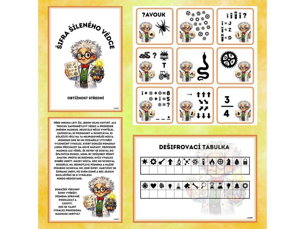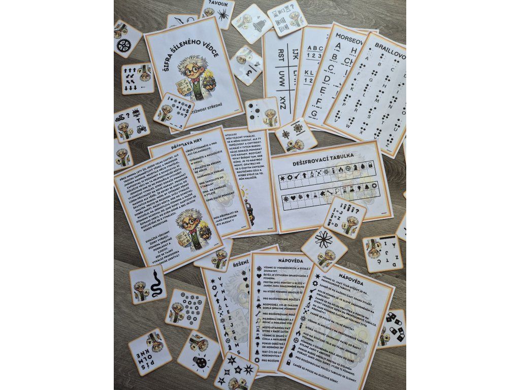 Šifra šíleného vědce je napínavá šifrovací hra pro děti školního věku a hravé dospělé. Geniální, ale poněkud šílený vědec ukryl svůj vynález a zabezpečil ho 26 různými šiframi, z nichž každá je jiná. K tomu, abys dokázal jeho vynález najít, musíš všechny šifry rozluštit, překonat jeho logické pasti a odhalit, kde se jeho tajemný vynález skrývá.