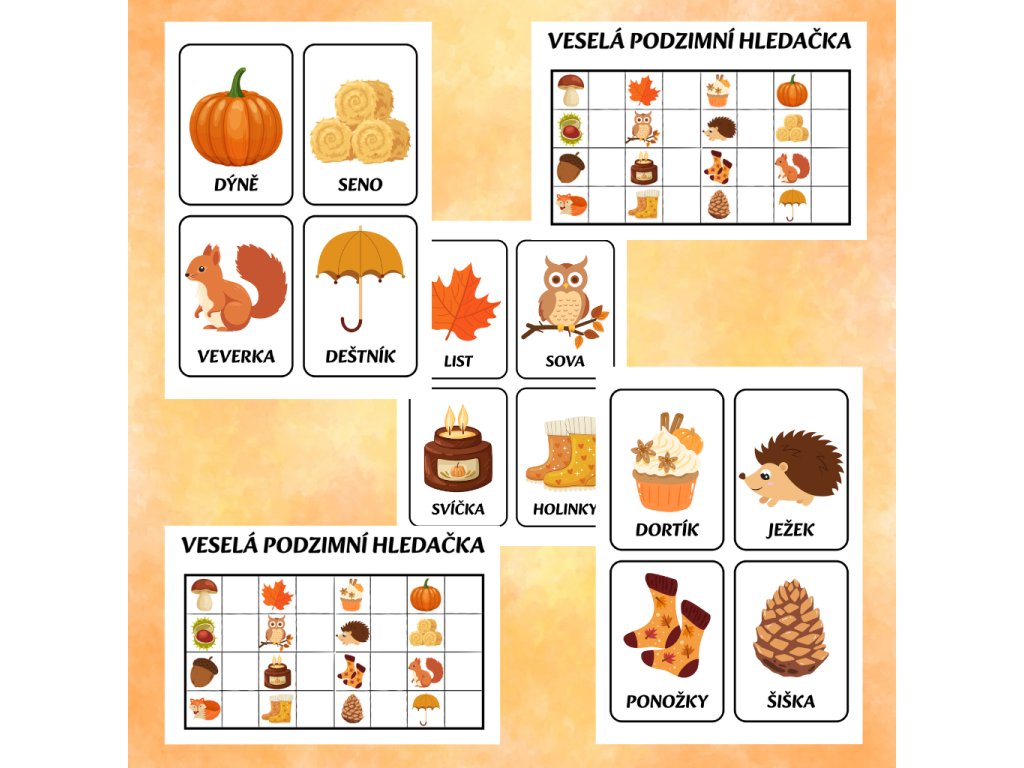 Hravé hledání a sbírání obrázků s podzimní tematikou, které děti motivuje k pohybu a pozornému pozorování. Během hry vyplňují políčka nebo sbírají razítka do kartičky, takže mají jasný cíl a radost z každého nalezeného obrázku.